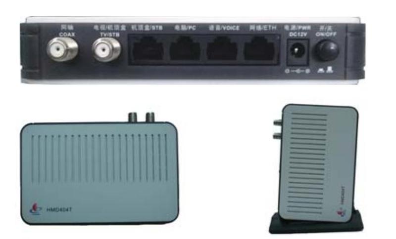 投标方 HMD404T系列EOC终端产品是采用同轴电缆到户接入方式的缆桥系统用户侧设备,位于同轴网络的用户端。向上,缆桥Modem设备——HMD404T同一个缆桥Master设备——HS4504Y相连;向下,HMD404T同用户家中的电脑或机顶盒连接,组成具备双向传输能力的互动有线网络,实现数据、视频、语音的三网融合接入。HMD404T可以作为单独的外置设备,安装在墙体的用户终端盒的同轴电缆输出口上,也可以放置在用户桌面。